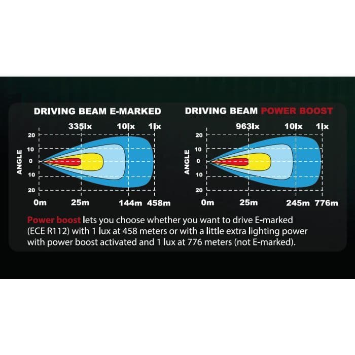 - Range: 458 m (1 lux), Powerboost: 776 m (1 lux)